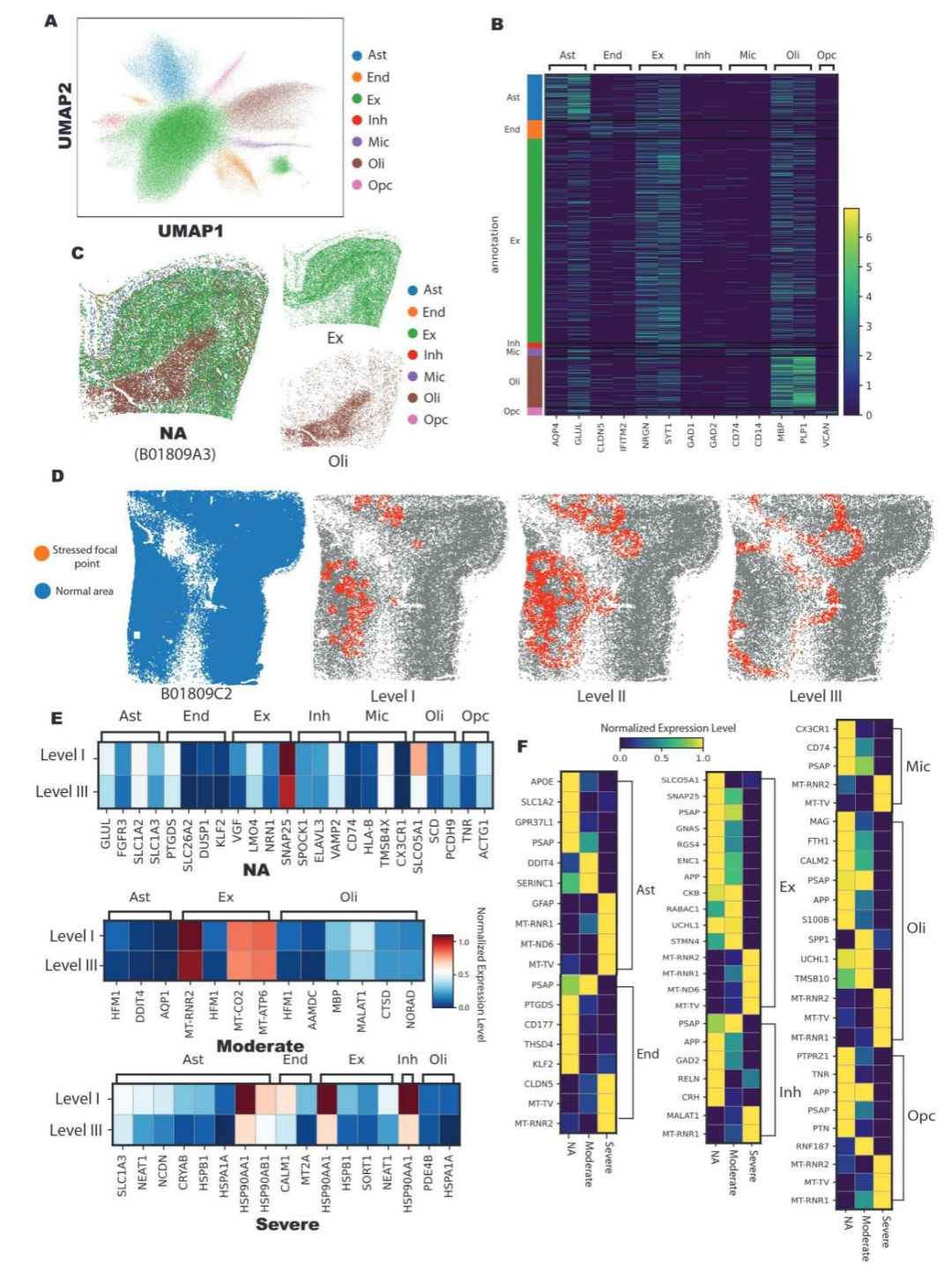 本研究首先对所有细胞核进行聚类分析(图 5A),并通过标记基因将其注释为兴奋性神经元、星形胶质细胞等主要细胞类型(图 5B),其空间分布与解剖结构高度一致(图 5C)。为解析细胞对 “高应激焦点” 的应答模式,研究以该焦点为中心,将周边细胞核按距离划分为三个同心圆层级(Level I 距离最近,Level III 距离最远)(图 5D),并基于此分组开展针对性分析。组内比较结果显示,正常衰老(NA)组中,紧邻应激焦点的神经元会特异性上调神经保护基因;而重度 AD 组中该调控模式完全消失,转而呈现热休克蛋白等全局应激基因的普遍性上调(图 5E)。组间比较发现,随着 AD 病情进展,即便处于最靠近应激焦点的前沿区域(Level I),各类细胞中 PSAP 等关键神经保护因子的表达也显著下调,提示其神经保护功能发生衰竭(图 5F)。