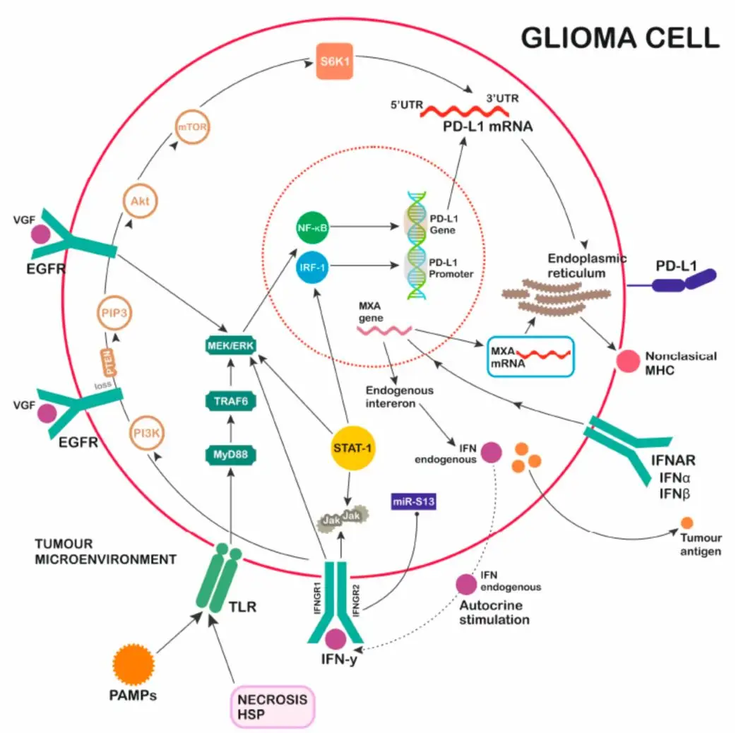 图2. GBM诱导PD-L1分泌。多种活化途径(TLR、EGFR、IFNAR、IFNGR)促进PD-L1表达:①Toll样受体(TLR)途径:病原体相关分子模式(PAMPs)、坏死、热休克蛋白(HSP)作为TLR髓样分化因子88(MyD88)依赖途径的激活剂,通过TRAF6/MEK/ERK/NF-κB传递信号。②表皮生长因子受体(EGFR)通路:TGFα/EGF/VGF/MUTATION OF RECEPTOR作为通过MEK/ERK(STAT-1)/NF-κB的EGFR通路信号的激活剂。③IFNAR通路:干扰素(IFN-α)和IFN-β作为IFNAR通路信号的激活剂,通过MXA基因转录,形成非经典MHC,促进PD-1L转录,并诱导内源性干扰素。④IFNGR通路:IFN-γ作为IIFNGR通路信号转导的激活剂,通过JAK/STAT-1/MEK/ERK/IRF-1和PI3K/PIP3/Akt/mTOR/S6K1,对转录的PD-1L mRNA具有调控功能。