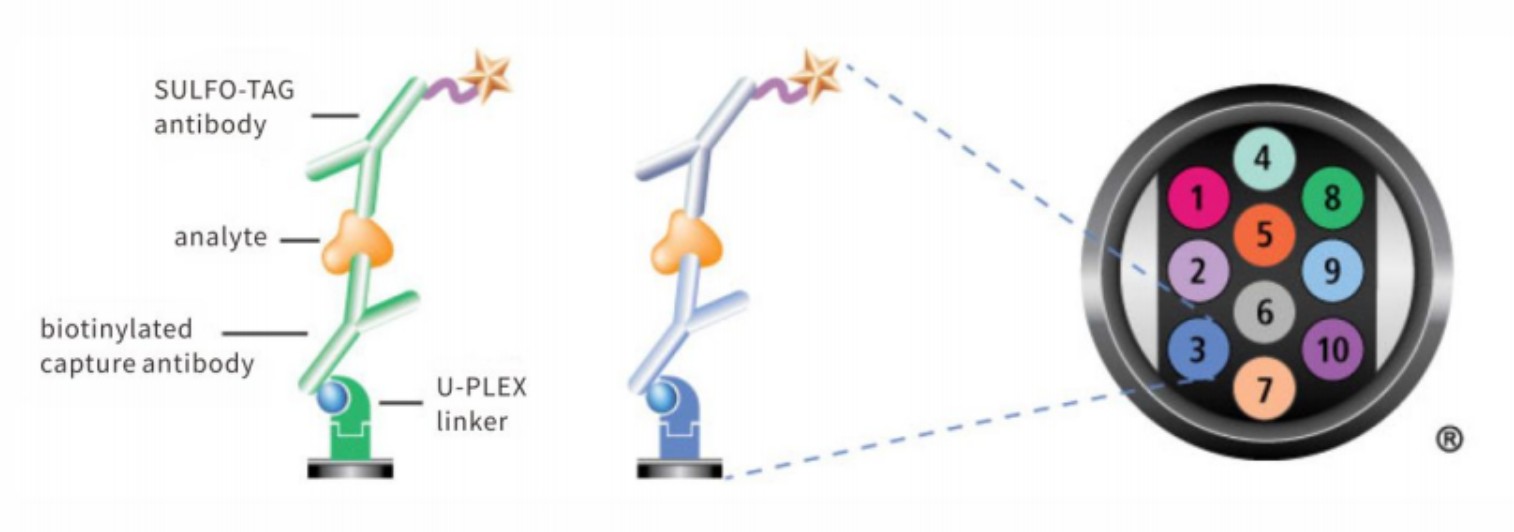 MSD技术则融合电化学与化学发光优势,以石墨电极微孔板为载体,将捕获抗体固定于电极表面,通过“捕获抗体-目标分子-SULFO-TAG™标记检测抗体”的夹心反应形成复合物。施加电压后,SULFO-TAG™标记物在电极表面发生循环氧化还原反应释放光子,信号强度与目标浓度呈正相关,凭借电化学信号的可控性,显著降低背景干扰,灵敏度可达fg级别,且支持每孔10-100种指标的定制化检测。