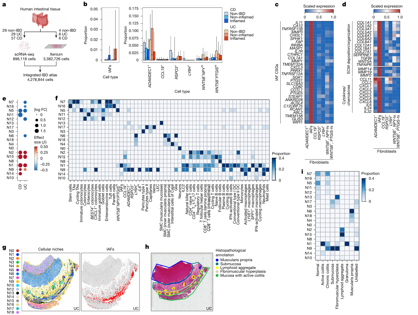 - 主要结果:炎症状态下,修复型 ADAMDEC1 + 成纤维细胞数量减少,而 IL-11 + 炎症相关成纤维细胞(IAFs)显著扩增;IAFs 特异性高表达纤维化相关基因(CD82、PRRX1)、细胞外基质(ECM)重塑基因(COL1A1、COL6A1)及中性粒细胞趋化因子(CXCL3、CXCL8)。通过细胞邻域分析识别出 19 个细胞生态位,IAFs 高度富集于 N1 和 N14 生态位,与 FCN1+IL1B + 活化巨噬细胞紧密共定位;这些生态位在纤维化和溃疡组织中高度富集,且主要分布于活动性 / 慢性结肠炎的黏膜区域。