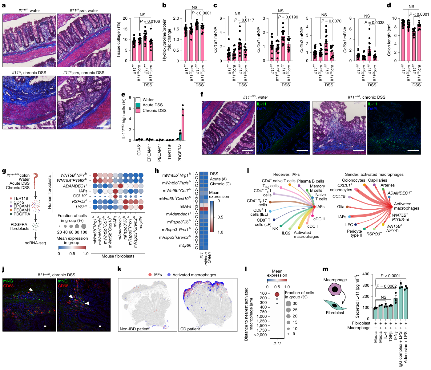 - 主要结果:①慢性 DSS 结肠炎模型中,IL-11 缺失可显著减少结肠胶原沉积、降低羟脯氨酸含量及纤维化相关胶原基因(COL1A1、COL6A1)表达,且不影响炎症严重程度,但能有效减轻炎症驱动的组织重塑;②跨物种比较证实,mIAFs 与人类 IAFs 高度同源,均高表达抗 TNF 治疗抵抗相关基因,且慢性 DSS 处理后 mIAFs 丰度显著升高,并特异性共表达 IL-11 与报告基因;③空间分析显示活化巨噬细胞与 IAFs 在体内紧密相邻(间距≤100μm),体外共培养实验进一步证实,促炎表型巨噬细胞可通过新生转录依赖机制,诱导成纤维细胞分泌 IL-11,明确活化巨噬细胞是 IAFs 的核心上游信号来源。