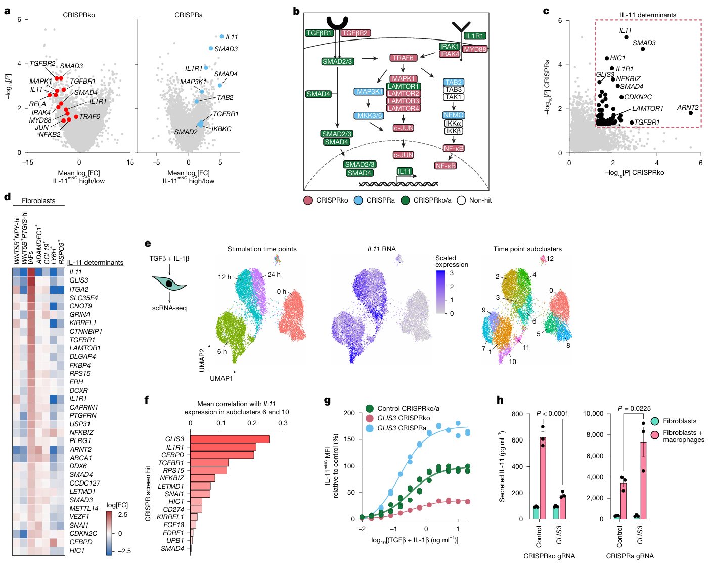 - 主要结果:①筛选共鉴定出 61 个调控 IL-11 表达的核心基因,涵盖 TGFβ/IL-1β 信号通路组件(TGFBR1、SMAD3、IRAK2)及免疫调节基因(LAMTOR1、NFKBIZ);②时间分辨 scRNA-seq 显示,TGFβ+IL-1β 刺激 6 小时后成纤维细胞启动 IL-11 表达,且该基因在簇 6 和簇 10 细胞中高富集,相关性分析明确转录因子 GLIS3 为调控 IL-11 的顶级候选基因;③双向功能验证证实,GLIS3 敲除可显著抑制成纤维细胞 IL-11 的表达与分泌,而 GLIS3 激活则能强效增强 IL-11 表达;进一步机制表明,活化巨噬细胞可诱导 GLIS3 在成纤维细胞中核定位,且 TGFβ 与 IL-1β 信号协同作用,促进 GLIS3 转录水平上调。