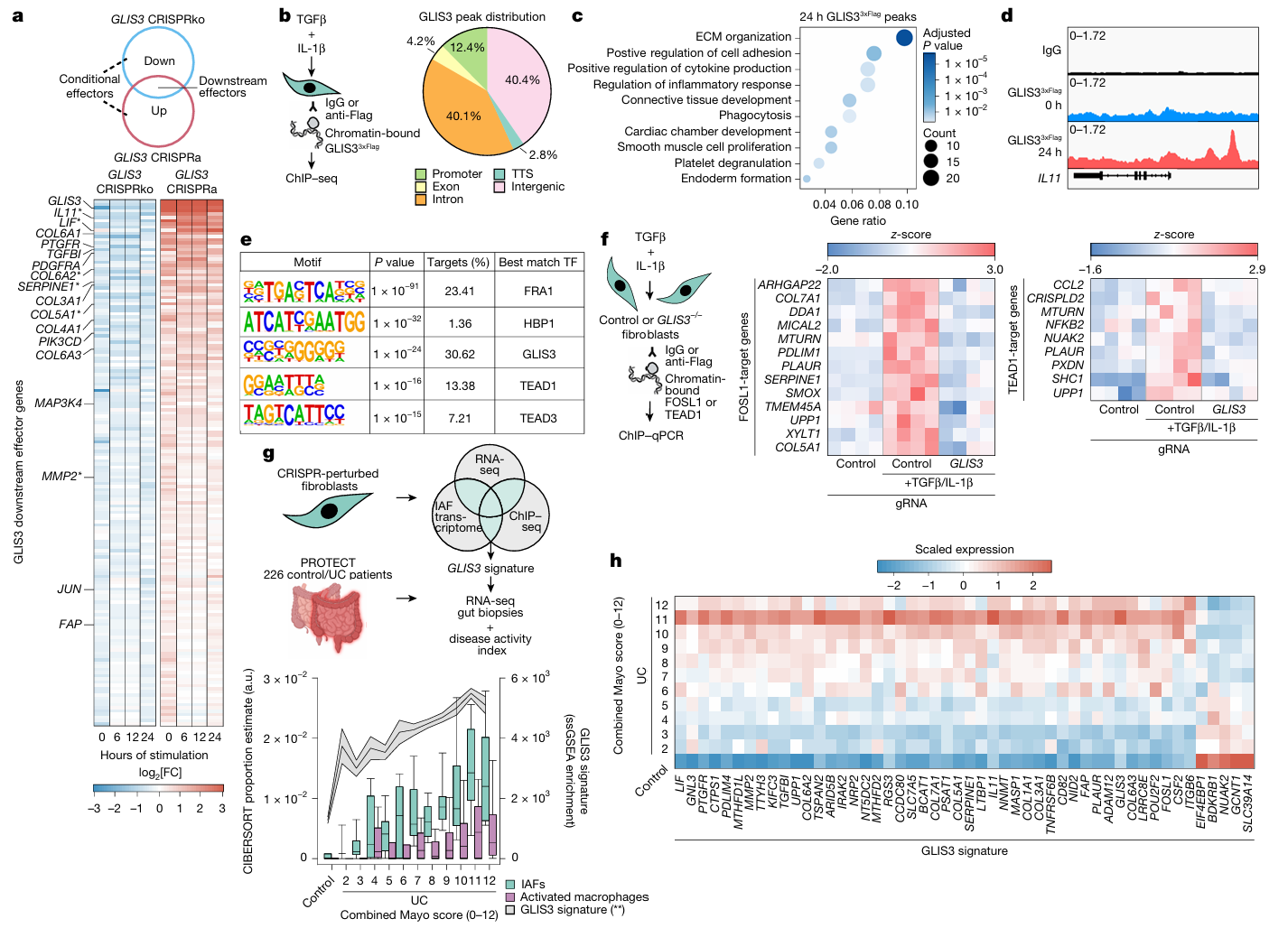 - 主要结果:①组学分析证实,GLIS3 可调控 150 余个下游效应基因,涵盖纤维化相关基因、炎症介质及组织重塑基因,且能直接结合 IL-11 转录起始位点上游区域,直接调控其表达;②基序分析显示,GLIS3 结合区域富集 FOSL1 和 TEAD1/3 转录因子结合基序,GLIS3 缺失会显著削弱 FOSL1 与 TEAD1 对靶基因的结合能力,提示三者存在协同调控网络;③基于 GLIS3 靶基因构建的特征评分,可有效对 226 例 UC 患者按疾病严重程度分层,该特征评分与 IAFs 及活化巨噬细胞丰度呈正相关,其中包含 GLIS3、IL-11 在内的 50 个核心基因,可独立预测患者疾病严重程度。