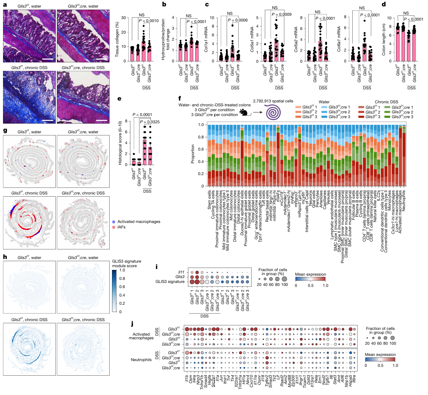 - 主要结果:①慢性结肠炎模型中,成纤维细胞特异性 Glis3 敲除小鼠的纤维化表型显著减轻,同时伴随炎症反应缓解、胶原沉积量减少,明确证实 Glis3 在肠道纤维化进程中发挥不可或缺的关键作用;②空间转录组分析显示,Glis3 敲除后,小鼠 IAFs(mIAFs)与活化巨噬细胞丰度显著下降,GLIS3 特征基因表达下调,中性粒细胞等免疫细胞比例降低,且 IL-1β、OSM、TNF 等纤维炎症介质的表达水平同步降低,提示 GLIS3 可调控纤维炎症微环境的整体稳态。