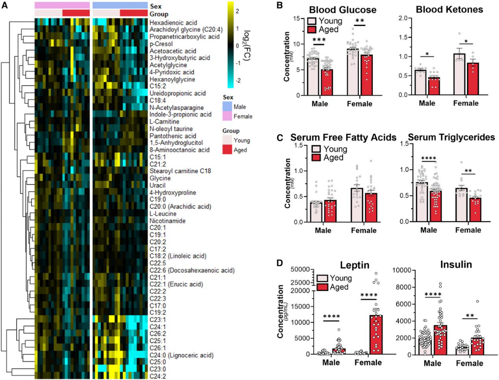 LC-MS检测显示,老年小鼠血清中约30%的代谢物呈现显著年龄相关性变化,5%的代谢物存在年龄×性别交互效应(图1A)。具体表现为血糖、酮体(3-羟基丁酸、乙酰乙酸)及甘油三酯浓度下降,而瘦素和胰岛素水平升高,提示老年小鼠可能通过增加胰岛素分泌维持葡萄糖稳态(图1B、D)。血清游离脂肪酸总量未随年龄显著变化,其中棕榈酸、油酸等主要脂肪酸浓度保持稳定(图1C)。这些结果表明,衰老虽未改变核心能量底物的整体供应,但显著重塑了血清代谢物的组成格局。