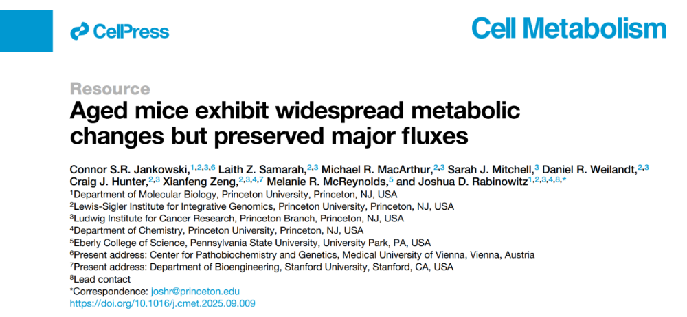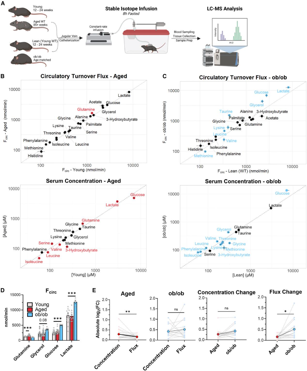 衰老过程伴随着机体代谢的系统性重构,表现为能量消耗下降、脂肪堆积、胰岛素抵抗等特征,这些变化与肥胖的代谢表型存在诸多相似之处,且二者均显著增加2型糖尿病风险并降低预期寿命。既往研究表明,老年哺乳动物存在碳水化合物向脂肪代谢的转变、线粒体功能减退、血清代谢组改变及NAD⁺、牛磺酸水平下降等现象,推动了生酮饮食、代谢物补充等抗衰老策略的探索。 代谢组学可量化代谢物浓度变化,而稳定同位素示踪技术能精准表征代谢通路活性(通量),二者结合为解析衰老相关代谢重构提供了有力工具。然而,现有研究多聚焦于单一性别小鼠的血清或特定器官代谢组,对衰老过程中循环及组织代谢通量的系统性评估尚不完善,仅证实烟酰胺和葡萄糖的循环通量在老年小鼠中得以维持。此外,衰老与肥胖引发的代谢通量改变是否存在本质差异,核心代谢通路在衰老中是否具备稳健性等关键问题仍不明确。 本研究通过整合代谢组学与稳定同位素示踪技术,全面解析衰老对小鼠代谢物浓度及通量的影响,对比衰老与肥胖的代谢重构差异,揭示衰老过程中代谢系统的核心特征与调控机制,为理解衰老的代谢基础及相关疾病防治提供实验支撑。