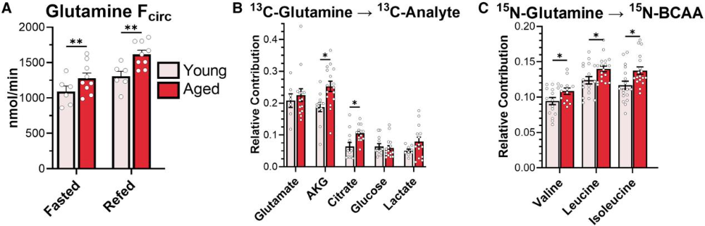 鉴于谷氨酰胺通量的独特变化,进一步追踪其代谢去向发现,老年小鼠在禁食和再喂食状态下均表现出谷氨酰胺循环通量升高(图3A)。双标记示踪实验证实,谷氨酰胺的¹³C标记更多进入α-酮戊二酸和柠檬酸,参与三羧酸循环的分解代谢,而未显著进入葡萄糖或乳酸(图3B);同时,谷氨酰胺的¹⁵N标记向支链氨基酸(缬氨酸、亮氨酸、异亮氨酸)的转移增加,提示转氨基通量升高(图3C)。这些结果表明,衰老过程中谷氨酰胺作为碳源和氮供体的利用效率均有所提升,可能为老年机体提供额外的能量和生物质合成原料。