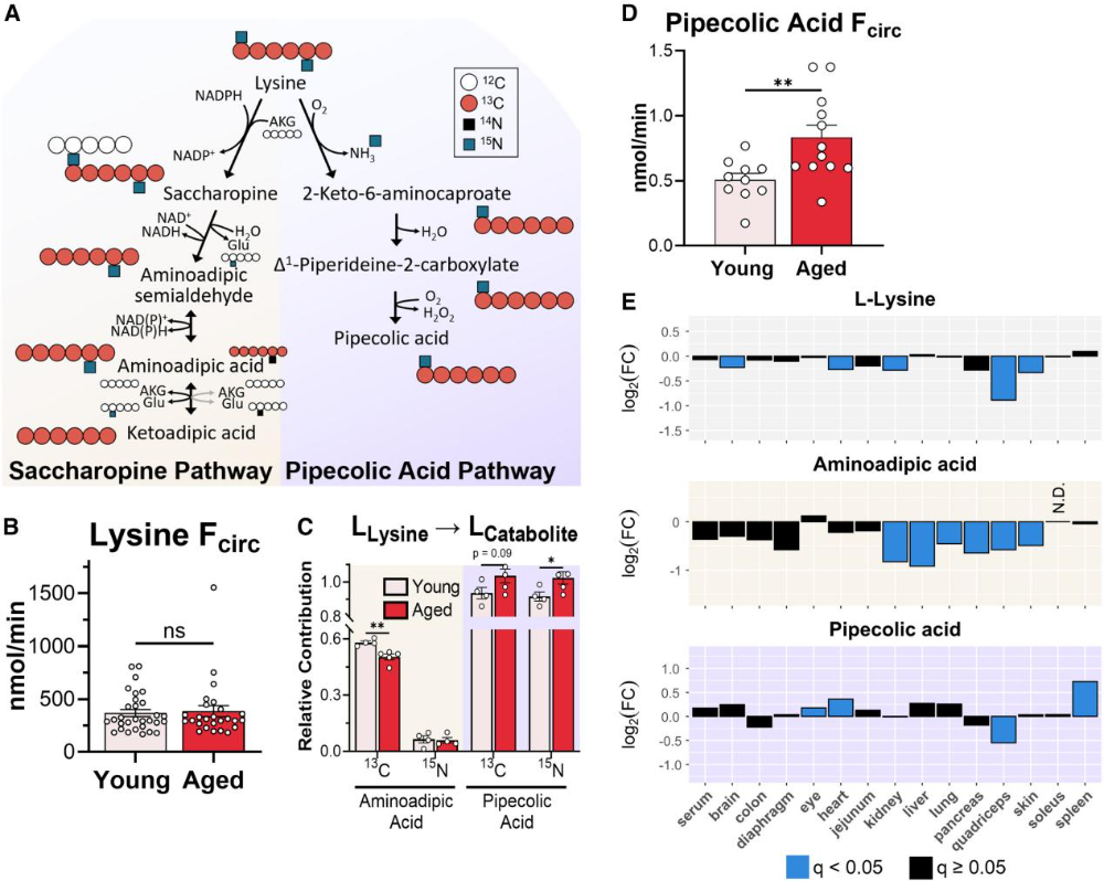 老年小鼠血清赖氨酸浓度未发生年龄相关性变化,但氨基己二酸水平下降、哌啶酸水平升高,二者分别源自赖氨酸分解的saccharopine途径和哌啶酸途径(图4A)。通量分析显示,老年小鼠的赖氨酸循环通量保持稳定,但赖氨酸向哌啶酸的转化增加,向氨基己二酸的转化减少,且哌啶酸的循环通量显著升高(图4B、D)。组织代谢组分析进一步证实,多个组织中赖氨酸浓度下降,氨基己二酸浓度广泛降低,而哌啶酸浓度普遍升高(图4E),表明衰老诱导赖氨酸分解代谢从saccharopine途径向哌啶酸途径转变,可能通过改变代谢产物的生物学功能影响衰老进程。