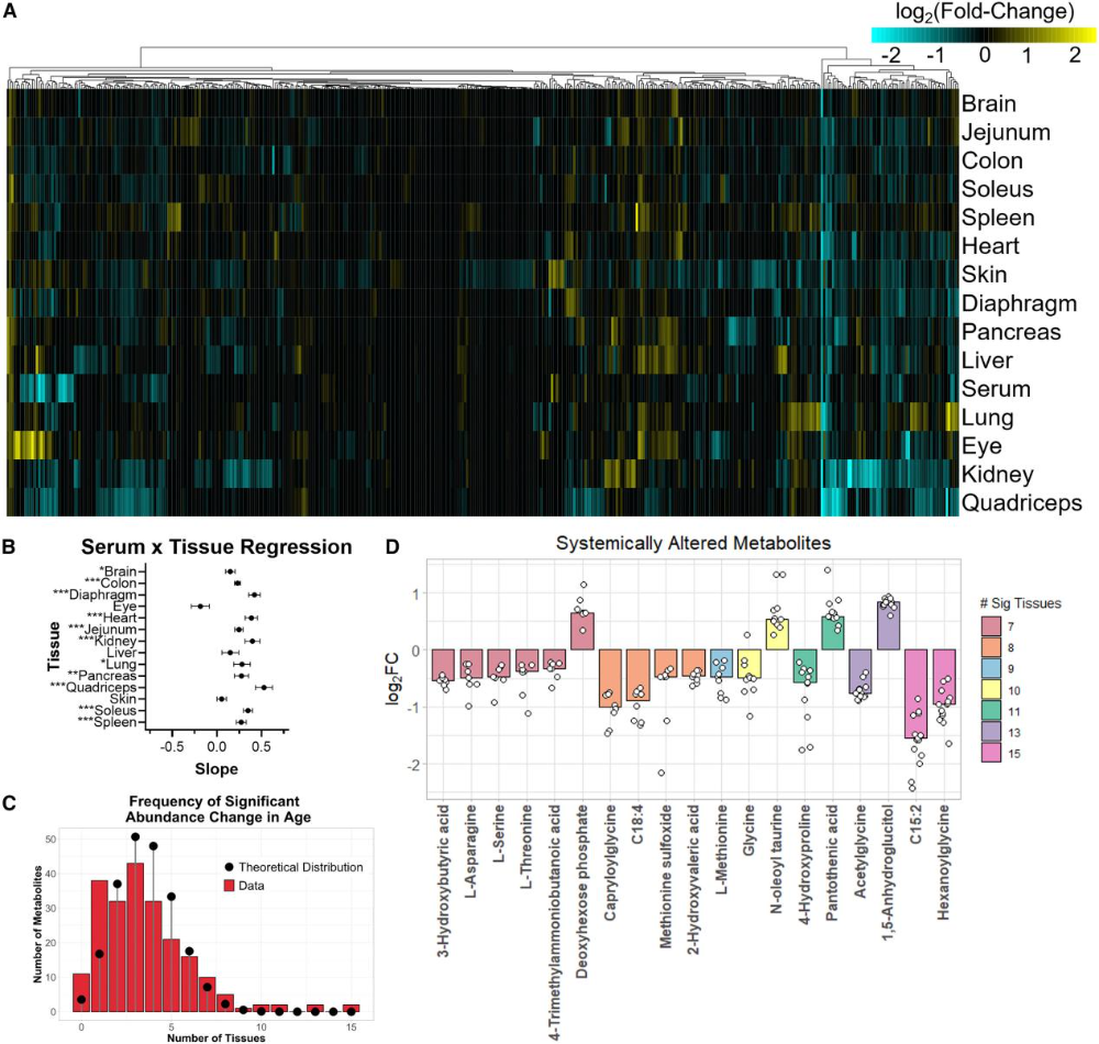 15种组织的代谢组分析显示,衰老诱导的代谢变化具有显著组织特异性:大脑和肠道代谢组高度保守,眼睛、肾脏和皮肤的改变最为显著;在肌肉组织中,心脏、比目鱼肌等抗肌肉减少症组织的代谢变化小于股四头肌(图6A)。此外,血清代谢物的变化幅度通常大于组织,且肌肉和肾脏的代谢变化约50%可由血清代谢组解释,而肝脏、大脑与血清的相关性较弱,眼睛则呈负相关(图6B)。进一步筛选出19种广泛衰老敏感型代谢物,在至少7/15的组织中表现出一致的年龄相关性变化,涉及多不饱和脂肪酸、氨基酸、酰基甘氨酸等,其中丝氨酸、甘氨酸等一碳代谢相关氨基酸水平普遍下降(图6C、D)。