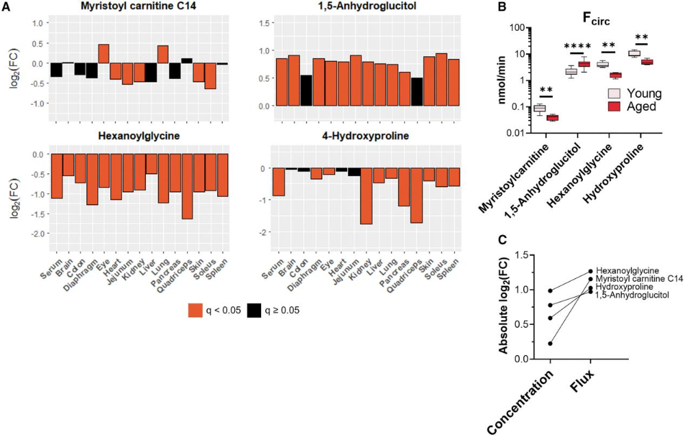 与核心代谢物不同,非核心代谢物的通量变化与浓度变化方向一致。例如,4-羟基脯氨酸、己酰甘氨酸和肉豆蔻酰肉碱(C14:0)的浓度在多组织中下降,其循环通量也显著降低;而1,5-脱水葡萄糖醇的浓度升高,通量亦增加(图7A、B)。更重要的是,这些非核心代谢物的通量变化幅度大于其平均丰度变化(图7C),表明核心代谢之外的途径在衰老过程中受到更强烈的调控,可能通过改变信号分子或功能代谢物的水平影响衰老表型。