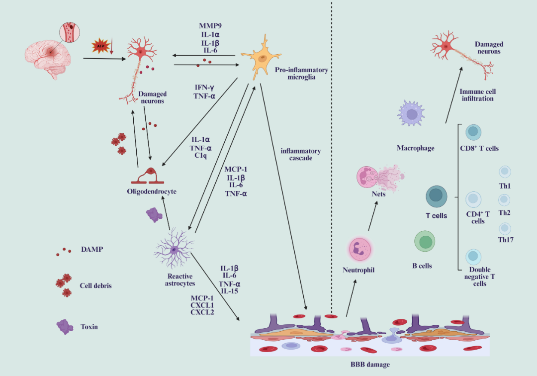 图 1. 缺血性损伤后,不同细胞来源引发的神经炎症和免疫介导的神经损伤