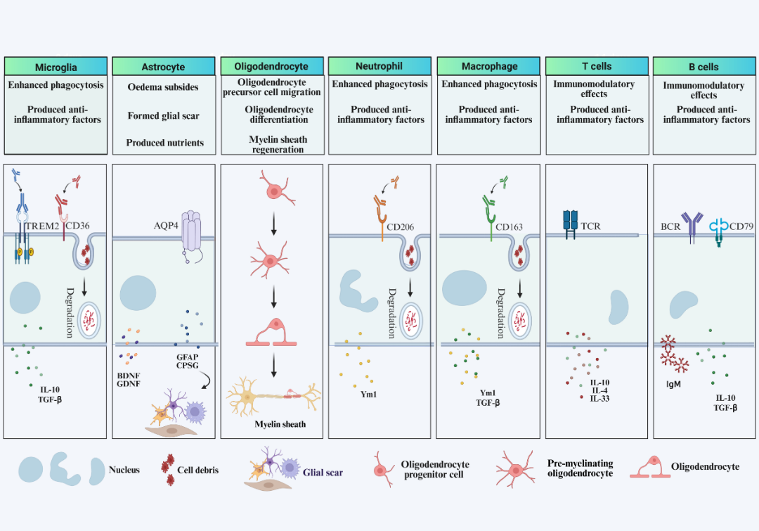 图 2.IS后不同细胞来源的神经炎症和免疫介导的神经修复示意图