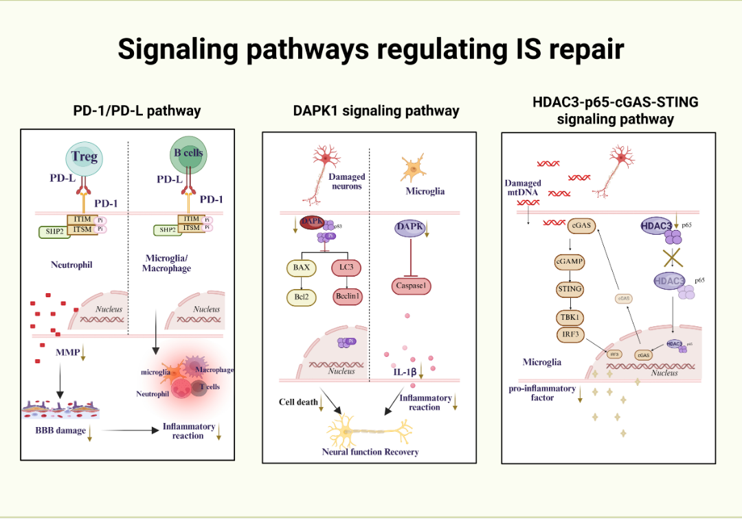 神经炎症和免疫反应的双面性由精密的信号通路网络调控,其中PD-1/PD-L、DAPK1和HDAC3-p65-cGAS-STING通路被证实是干预缺血性卒中的核心靶点,其机制解析为治疗策略开发提供了分子基础。