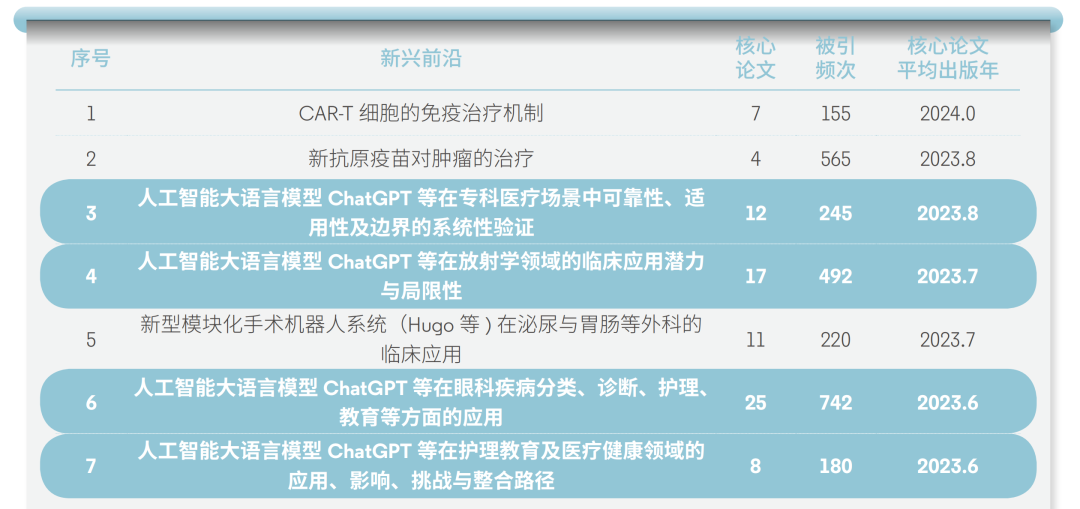 2025 年度遴选出 7 个新兴前沿方向,主要聚焦四大领域:CAR-T 细胞免疫治疗的作用机制研究、新抗原疫苗在肿瘤治疗中的应用探索、Hugo 等新型模块化手术机器人系统于泌尿、胃肠等外科的临床应用,以及 ChatGPT 等人工智能大语言模型在医疗健康领域的应用拓展。