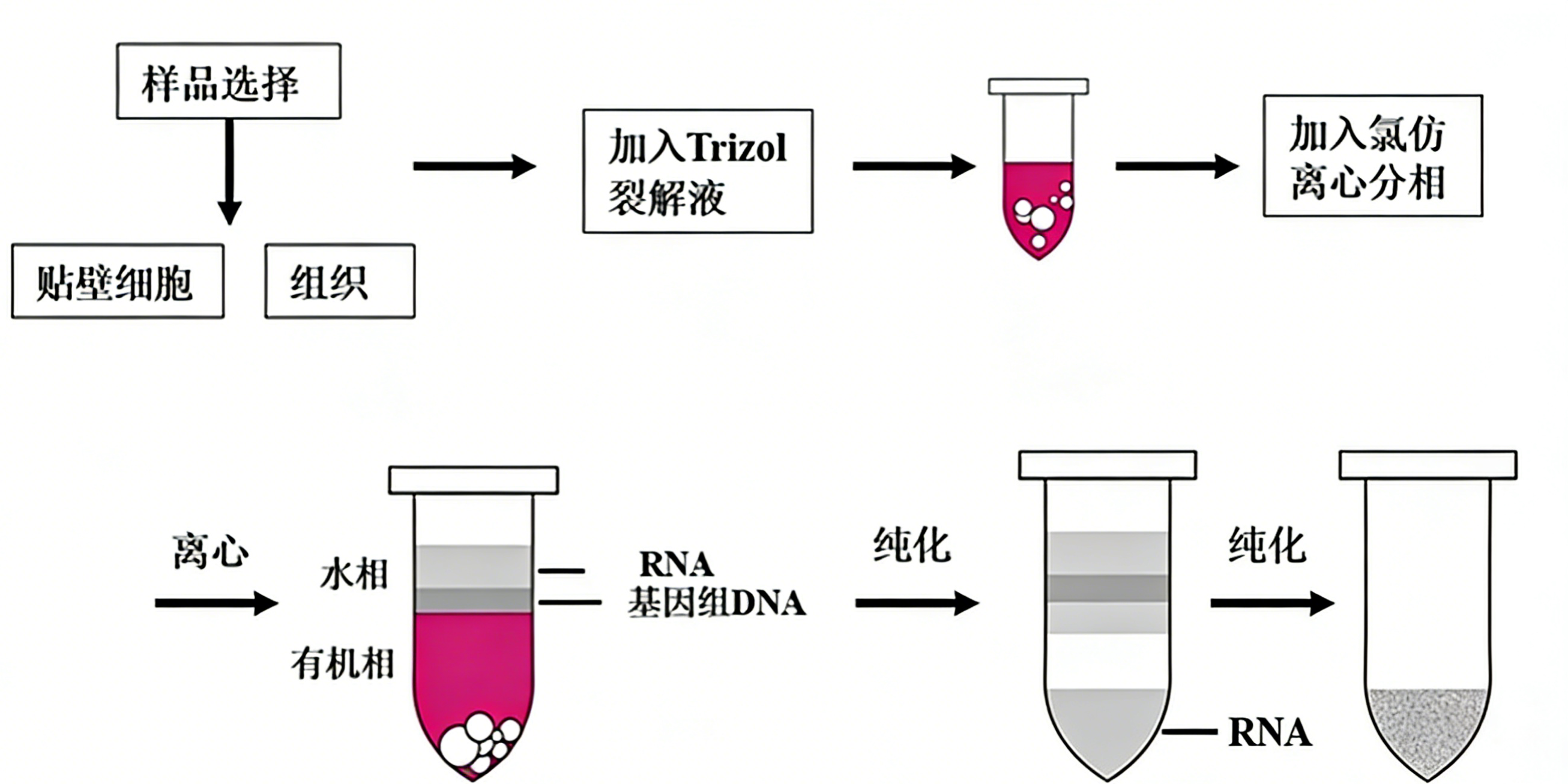 该方法具有操作简便、适用范围广、提取快速等优点。实验前需确保准备好关键试剂(TRIzol试剂、氯仿、异丙醇、75%乙醇、无RNase水)及经无RNase处理的耗材(如离心管、枪头等),以避免RNA在操作过程中被降解。
