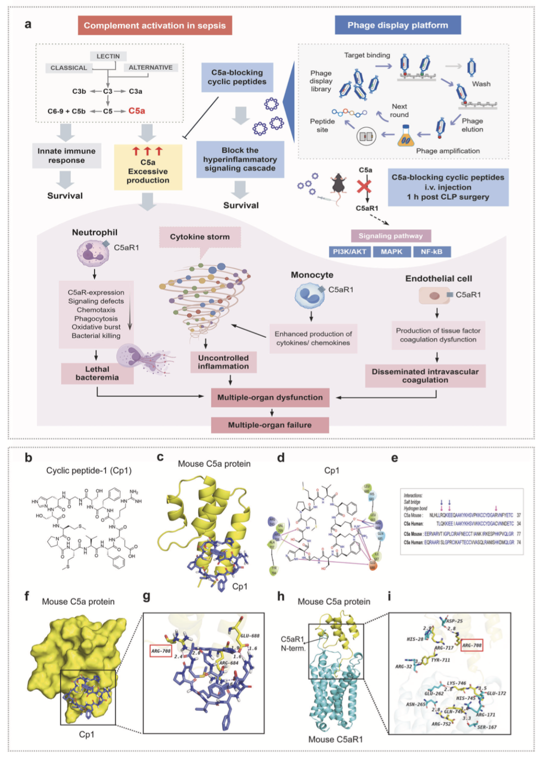脓毒症是由感染引发宿主免疫反应失调,进而导致严重器官功能障碍、病死率极高的危重症,探寻安全有效的干预手段迫在眉睫。鉴于现有脓毒症相关药物临床试验多以失败告终,本研究通过噬菌体筛选技术,研发并验证了一种新型长效 C5a 阻断环状肽 Cp1,其通过靶向中和炎症上游关键分子 C5a,阻断其介导的炎症级联放大反应。感染早期应用 Cp1,可高效抑制炎症因子瀑布效应,遏制失控性全身炎症的发生发展,为脓毒症的防治提供新方向。
