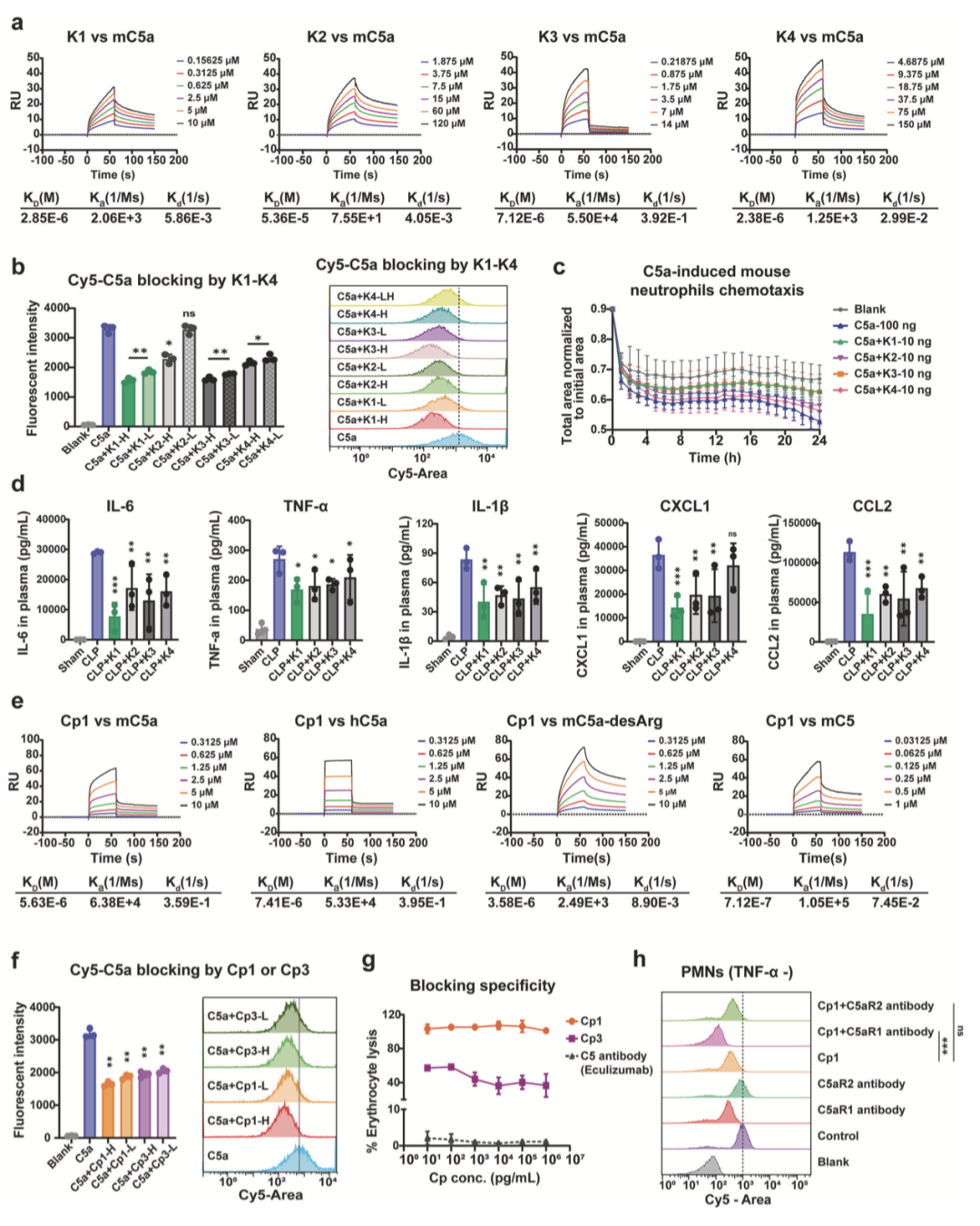为提升线性肽K1、K3的结合亲和力、结构稳定性及体内阻断效力,作者对其进行头尾环化修饰,得到环状变体Cp1、Cp3。表面等离子体共振技术检测显示,Cp1、Cp3与mC5a的结合亲和力KD值分别为5.63×10⁻⁶、3.23×10⁻⁶(图2e);Cp1与人源C5a(KD=7.41×10⁻⁶)的结合动力学特性与mC5a相近,且可结合小鼠C5a-desArg(KD=3.58×10⁻⁶)及小鼠C5(KD=7.12×10⁻⁷)(图2e),体外竞争性结合实验进一步验证了二者对mC5a的阻断效力(图2f)。