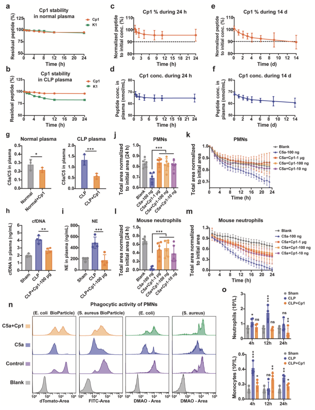37℃条件下,采用正常小鼠及CLP模型小鼠50%(v/v)血浆评估Cp1与K1的稳定性,HPLC结果显示,二者在正常血浆中稳定性相当,而环化修饰显著提升K1在CLP血浆中的稳定性,孵育24小时后Cp1保留率超95%(图3a, b)。正常小鼠药代动力学研究显示(100μg/20g Cp1),Cp1在24小时内缓慢消除,给药14天后血浆初始浓度(68 nmol/mL)保留率仍达90%(图3c-f)。