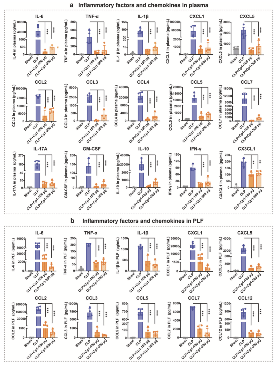 实验结果 6 Cp1 处理显著抑制 CLP 诱导脓毒症小鼠血浆及腹腔冲洗液(PLF)中炎症因子与趋化因子的表达