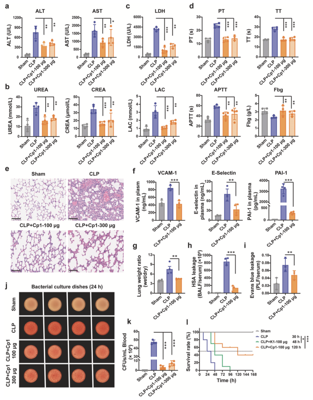 脓毒症高死亡率主要源于重要器官损伤及急性衰竭。Cp1治疗可有效降低血清丙氨酸氨基转移酶(ALT)和天冬氨酸氨基转移酶(AST)水平,提示其对肝功能具有保护作用(图5a)。与未治疗CLP小鼠相比,Cp1处理组血清肾损伤标志物尿素(UREA)和肌酐(CREA)水平显著降低(图5b)。血清乳酸脱氢酶(LDH)和乳酸(LAC)升高提示组织损伤,Cp1处理组二者水平显著下降,进一步证实其强大的器官保护效能(图5c)。