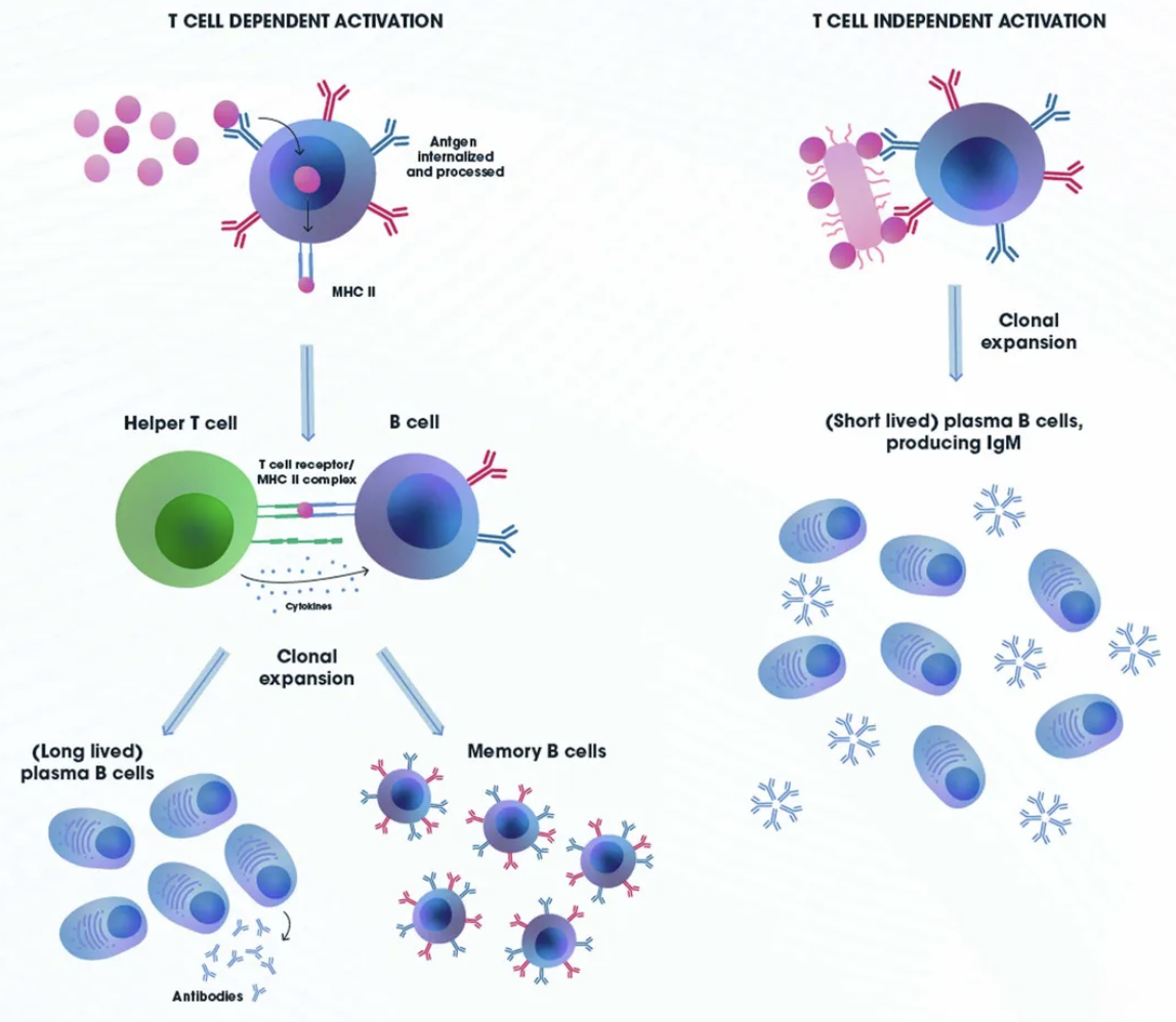 B淋巴细胞(B lymphocyte)作为适应性免疫系统的关键组成部分,其核心功能是通过产生特异性抗体中和病原体,并形成长期免疫记忆以应对再次感染。B细胞活化是一个多阶段、多分子参与的复杂调控过程,涉及抗原识别、信号转导、细胞增殖及分化等一系列生物学事件。根据是否依赖辅助性T细胞(Th细胞)的协助,B细胞活化主要分为T细胞依赖性(T-dependent, TD)活化和T细胞非依赖性(T-independent, TI)活化两种方式,二者分别针对不同类型抗原启动免疫应答,共同构成了机体高效的体液免疫防御体系。深入解析B细胞活化的分子机制,对于阐明免疫应答的调控规律、开发新型疫苗及免疫治疗策略具有重要意义。