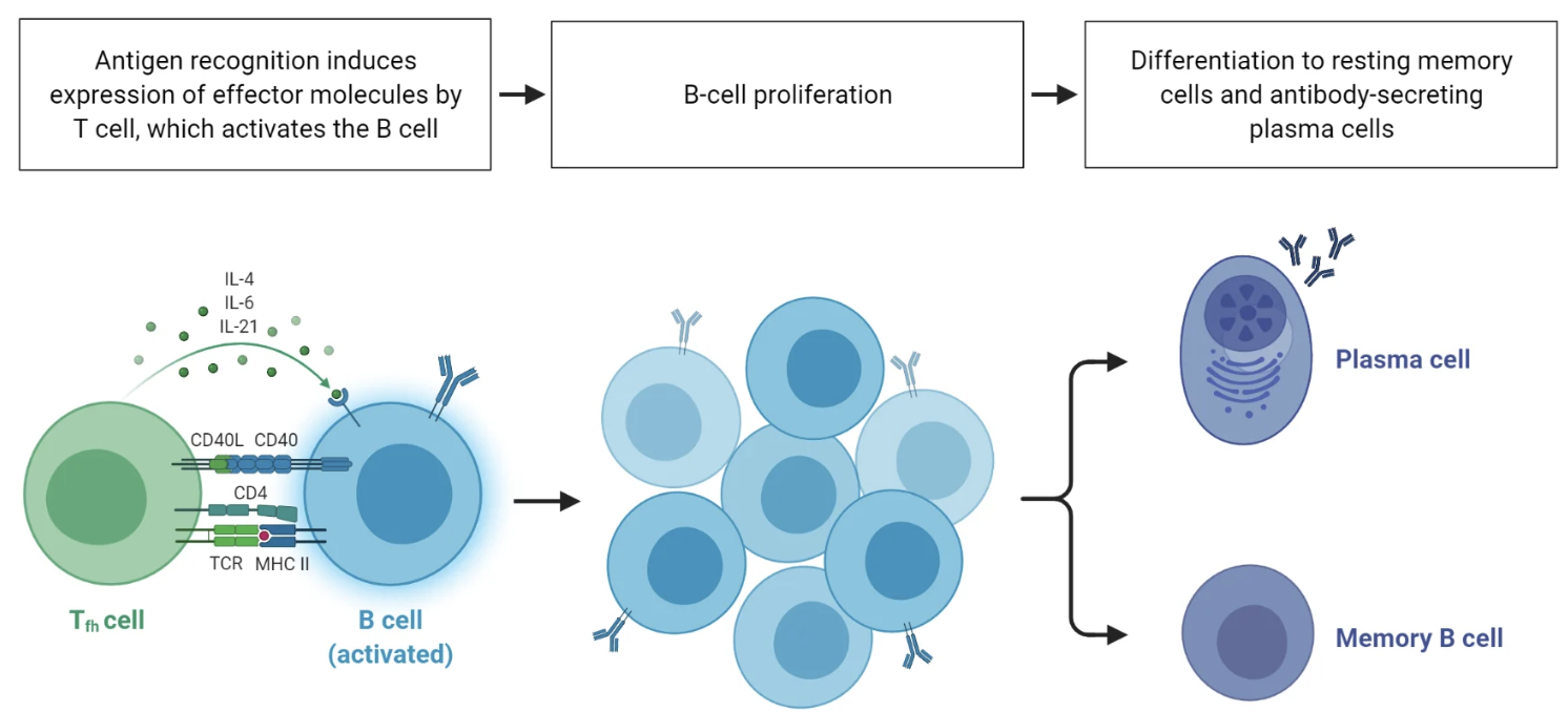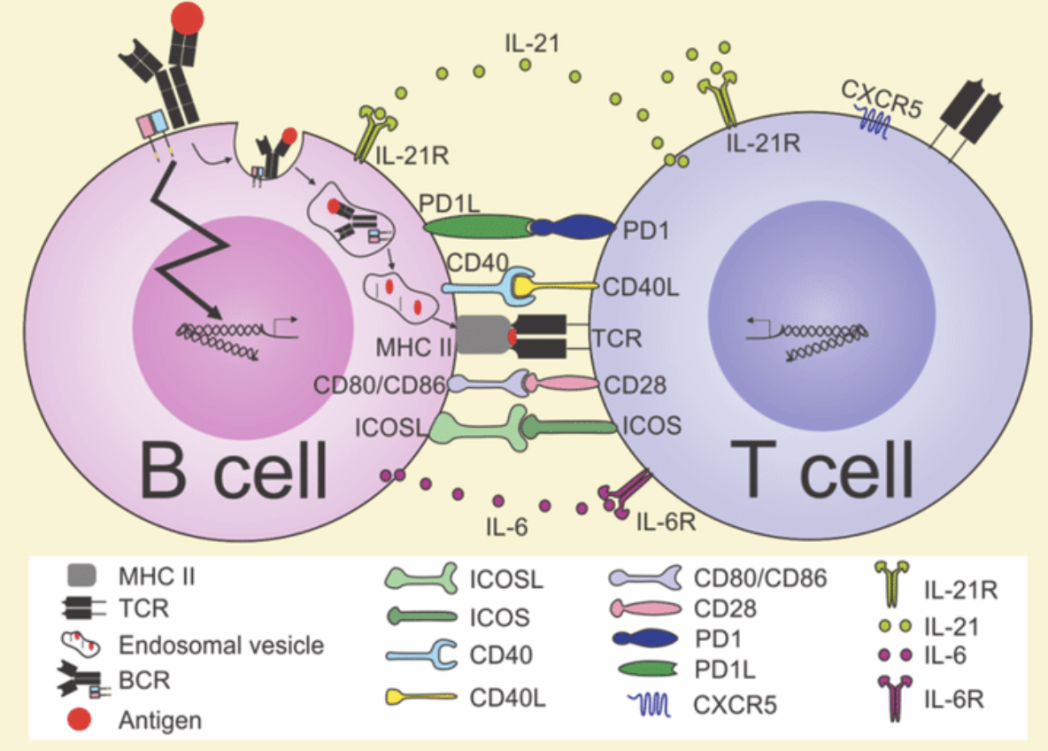 3. 细胞因子调控:活化后的辅助性T细胞分泌多种细胞因子,包括IL-4、IL-5、IL-6、IL-21等,这些细胞因子通过与B细胞表面的相应受体结合,调控B细胞的增殖、分化及抗体类别转换。