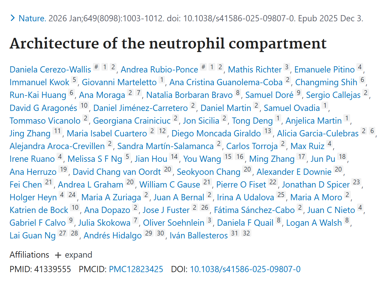 Cerezo-Wallis D, Rubio-Ponce A, et al. Architecture of the neutrophil compartment. Nature. 2026 Jan;649(8098):1003-1012.