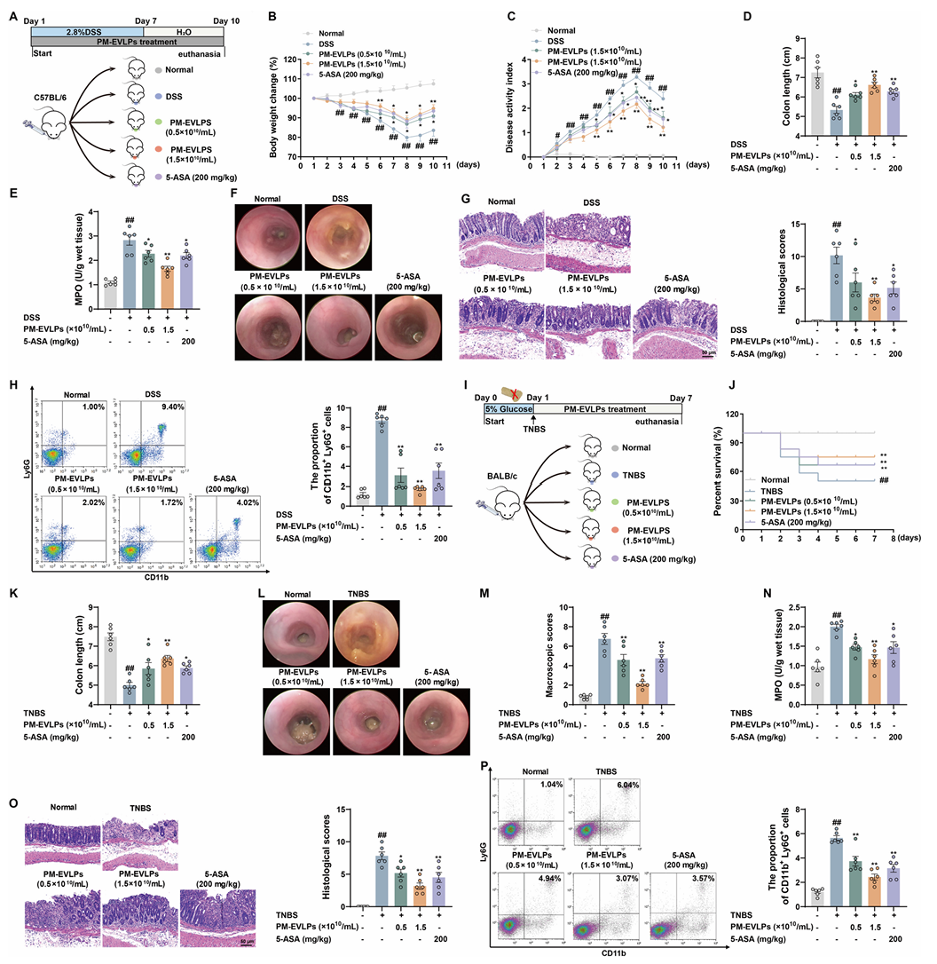 在DSS诱导的小鼠结肠炎模型中,口服PM-EVLPs可呈剂量依赖性改善小鼠体重下降趋势,降低疾病活动指数(DAI),增加结肠长度,同时显著降低髓过氧化物酶(MPO)活性、减少中性粒细胞浸润(Fig.2B-H)。高分辨率内镜及组织病理学检测结果显示,PM-EVLPs能够有效减轻结肠上皮损伤、黏膜水肿及炎症细胞浸润程度(Fig.2F-G)。