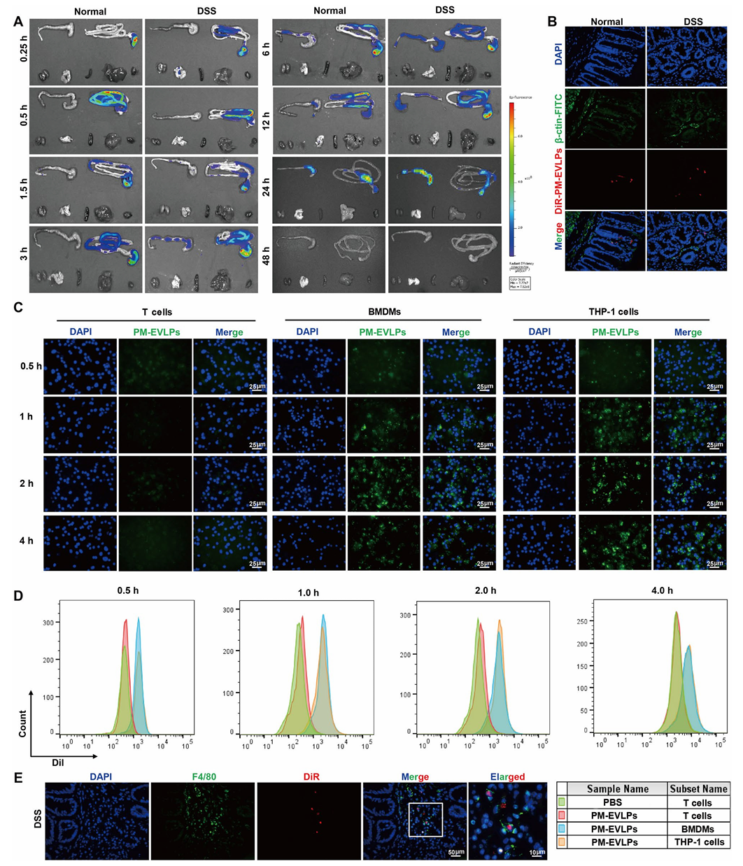 体内生物分布显示,DiR标记的PM-EVLPs口服后在DSS结肠炎小鼠中优先富集于炎症结肠组织,24h达峰值,48h基本清除(Fig.3A)。免疫荧光显示其主要定位于结肠黏膜层固有层(Fig.3B)。细胞摄取实验表明,巨噬细胞(BMDMs和THP-1细胞)对PM-EVLPs的摄取效率显著高于T细胞(Fig.3C-D)。结肠组织共定位实验证实,PM-EVLPs可被F4/80⁺巨噬细胞内化(Fig.3E)。