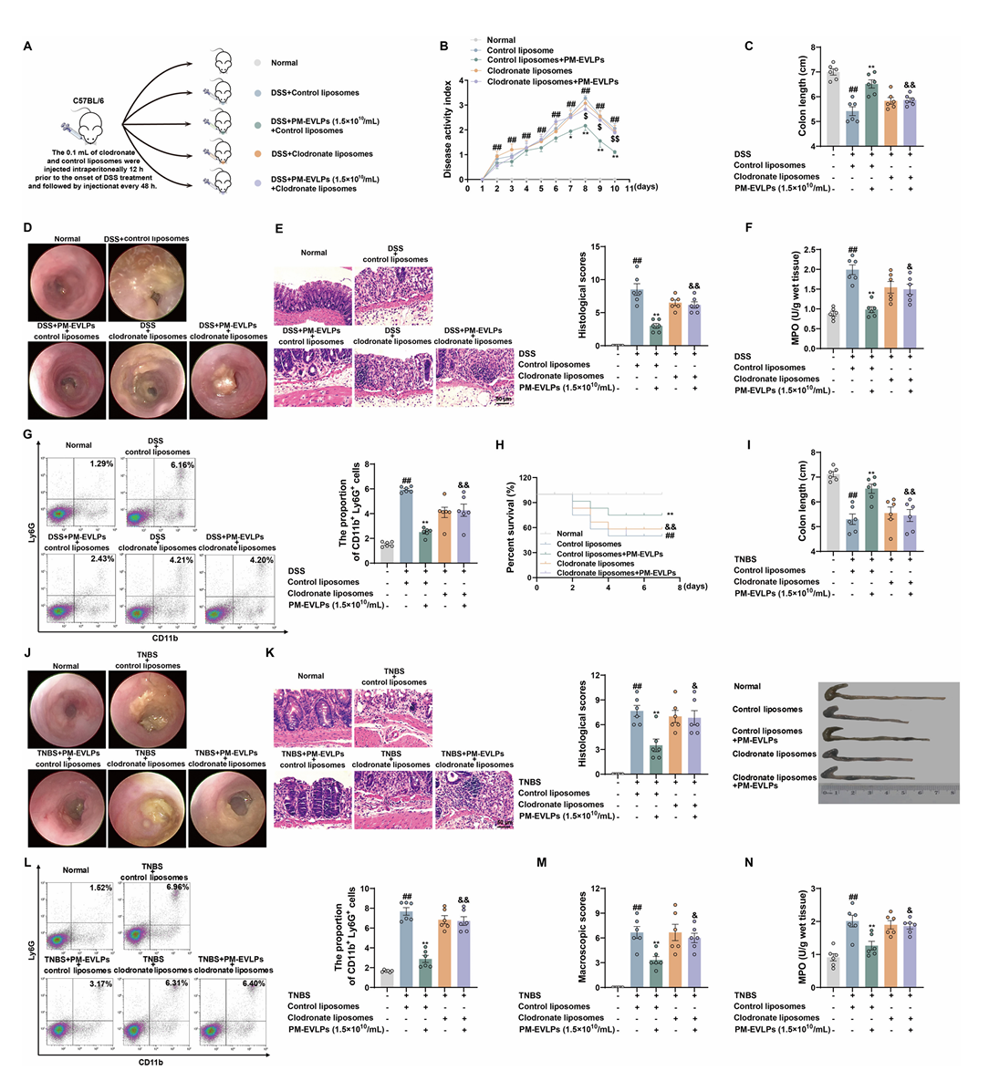 氯膦酸脂质体清除小鼠巨噬细胞后,PM-EVLPs对DSS及TNBS诱导结肠炎的保护作用显著减弱,表现为DAI评分升高、结肠缩短、炎症浸润加重(Fig.4A-G、H-N),证实巨噬细胞是PM-EVLPs发挥抗结肠炎效应的关键靶细胞。