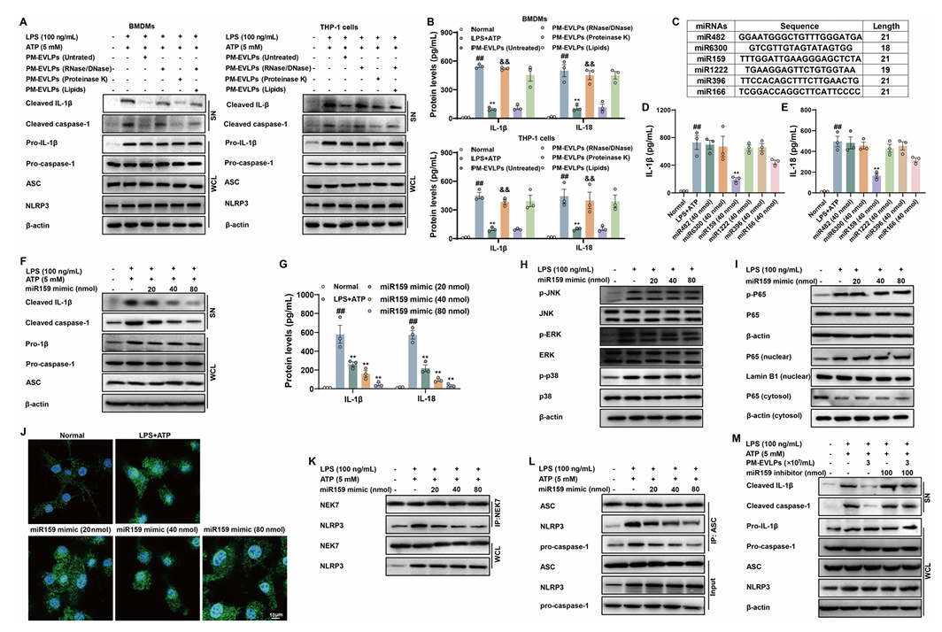 成分筛选显示,DNase I/RNase 处理可消除 PM-EVLPs 的抗炎活性,而蛋白酶 K 或脂质提取对其活性无明显影响(Fig.7A-B),提示活性成分为 RNA。miRNA 测序共鉴定出 94 种 miRNA,其中 miR159、miR482 等丰度最高(Fig.7C)。体外实验表明,仅 miR159 模拟物可重现 PM-EVLPs 的作用,呈剂量依赖性抑制 NLRP3 炎症小体激活,降低 IL-1β、IL-18 分泌(Fig.7D-G)。miR159 不影响 NF-κB 与 MAPK 通路,可抑制 NEK7-NLRP3 相互作用及炎症小体组装(Fig.7H-L);miR159 抑制剂可逆转 PM-EVLPs 的抗炎效应(Fig.7M)。