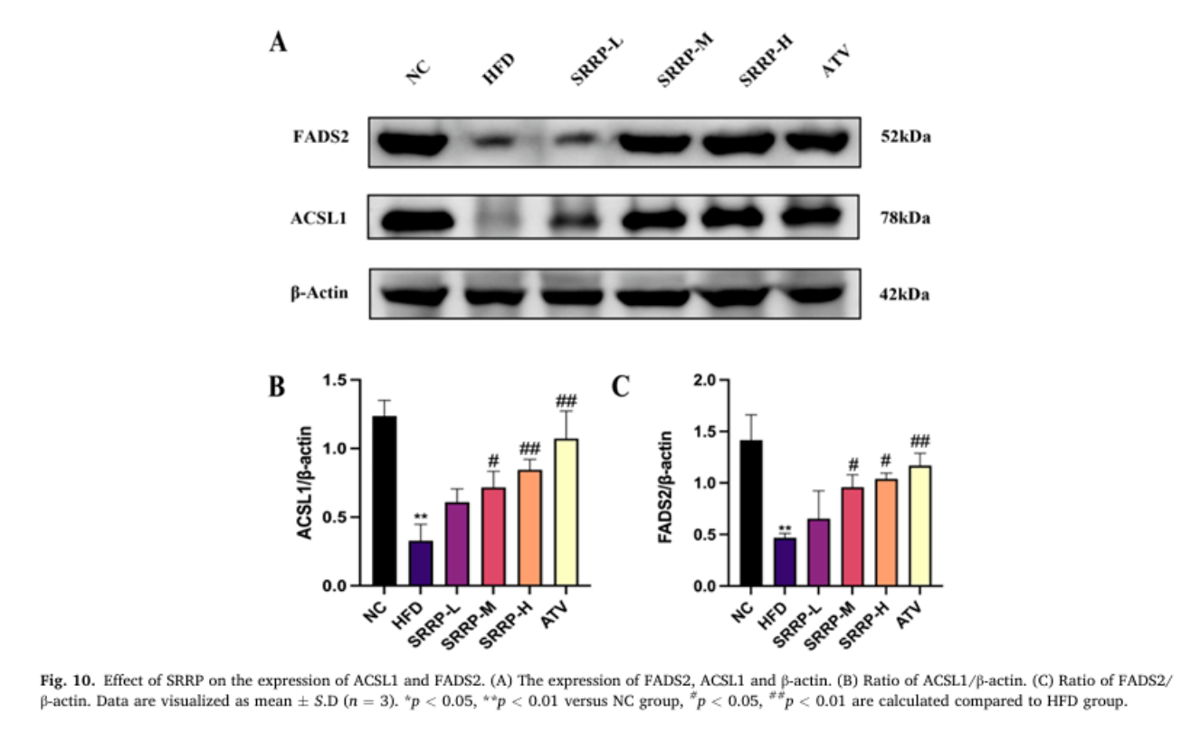 Western Blot实验证实,与HFD组相比,SRRP干预显著上调肝脏中ACSL1与FADS2的蛋白表达水平。ACSL1可促进脂肪酸β氧化,FADS2参与不饱和脂肪酸合成,二者共同作用将饱和脂肪酸代谢为不饱和脂肪酸,优化脂质代谢流,减少肝脏脂质堆积。
