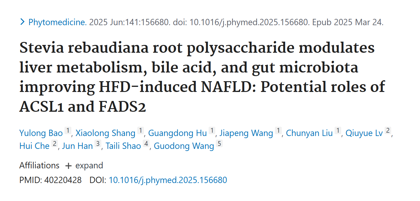 Bao Y, Shang X, et al. Stevia rebaudiana root polysaccharide modulates liver metabolism, bile acid, and gut microbiota improving HFD-induced NAFLD: Potential roles of ACSL1 and FADS2. Phytomedicine. 2025 Jun;141:156680.