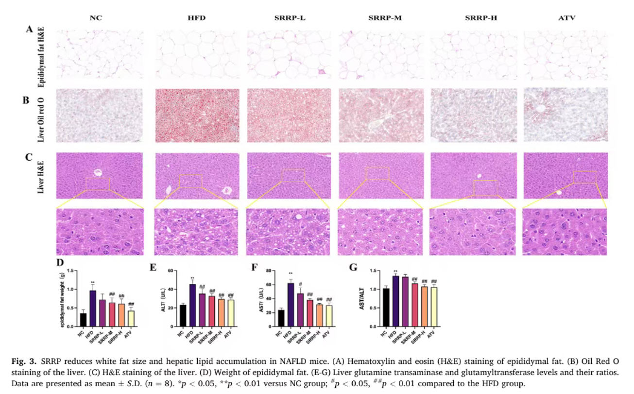 H&E染色结果显示,SRRP干预可有效减小HFD诱导的小鼠白色脂肪液泡直径,降低附睾脂肪重量;H&E染色与油红O染色观察发现,SRRP显著减少了肝内脂质沉积。同时,SRRP还能改善高脂饮食诱导的ALT、AST水平及AST/ALT比值升高,减轻肝脏损伤。