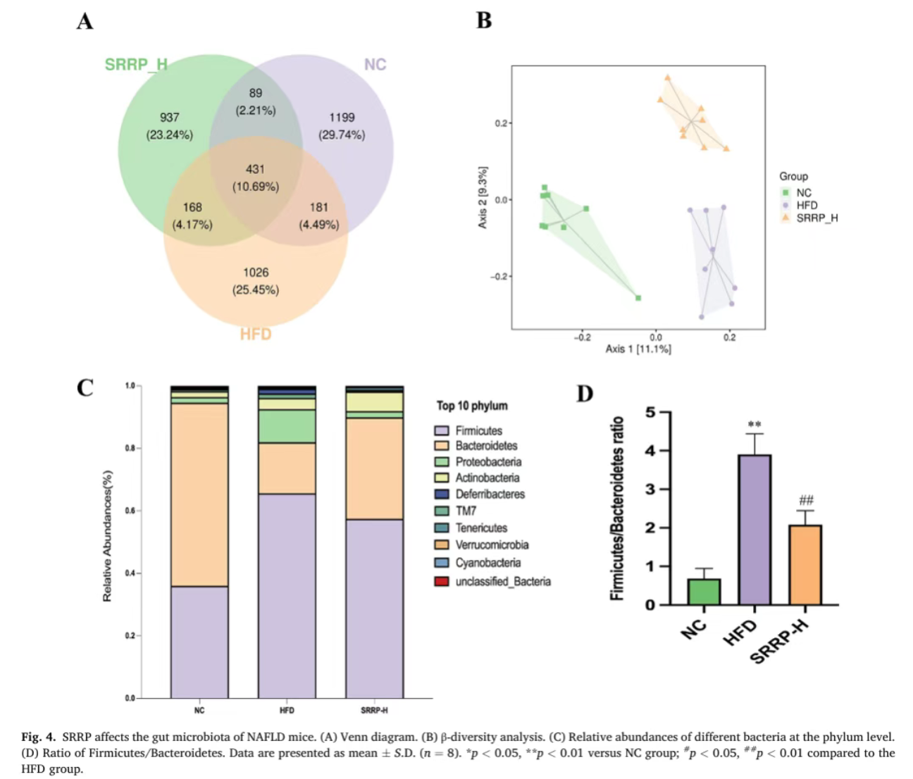 16S rRNA测序结果显示,HFD组与NC组小鼠肠道菌群β多样性存在显著差异,菌群聚类模式完全不同;SRRP干预后,小鼠肠道菌群结构向NC组趋近。门水平分析表明,SRRP显著降低了HFD诱导升高的厚壁菌门/拟杆菌门比值;物种组成分析显示,SRRP干预可显著减少脱硫弧菌属、梭菌属等有害菌丰度,同时富集阿克曼菌、丁酸单胞菌属等有益菌,增强肠道屏障功能。