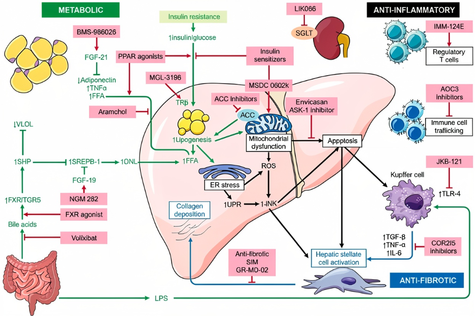 NASH的疾病进程并非由单一因素驱动,而是“多重打击”或“平行打击”综合作用的结果。这为多靶点干预提供了坚实的病理生理学基础。核心干预路径主要聚焦于以下几个方面: