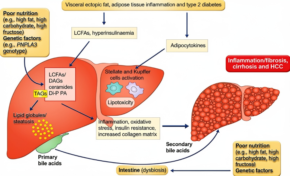 2. 炎症与细胞应激的综合管理: 脂毒性引发肝细胞应激(如内质网应激、氧化应激),进而激活以Kupffer细胞为主的固有免疫系统,释放大量促炎细胞因子(如TNF-α, IL-1β, IL-6),形成慢性低度炎症状态。多靶点干预需同时减轻细胞应激损伤,并抑制关键炎症信号通路(如NF-κB, JNK通路)的过度活化。