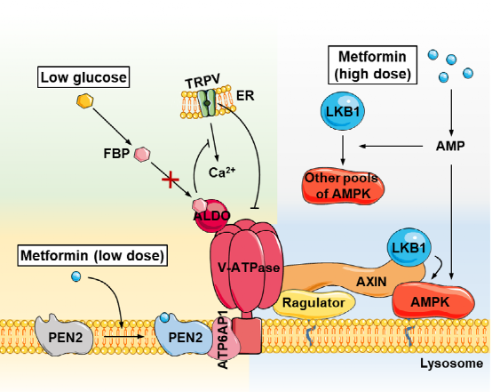 该机制使得低剂量二甲双胍能够利用一条与AMP浓度无关的AMPK激活途径,此途径同样可被葡萄糖饥饿状态所触发。值得注意的是,PEN2-ATP6AP1通路并不参与低葡萄糖水平下的AMPK激活,表明其是作用于v-ATP酶复合体的平行调控途径。