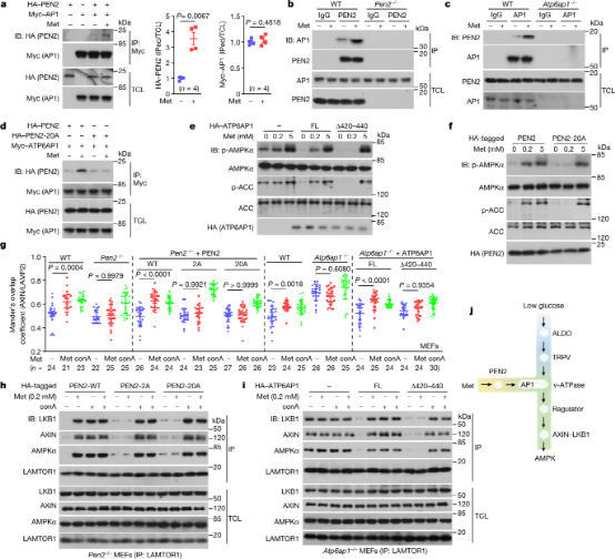 研究证实PEN2是二甲双胍的直接作用靶点。在二甲双胍刺激下,PEN2与v-ATP酶亚基ATP6AP1结合,从而抑制v-ATP酶活性,并在不升高AMP或ADP水平的情况下激活溶酶体AMPK。由此形成的PEN2-ATP6AP1信号轴与已知的溶酶体v-ATP酶-AXIN-AMPK通路交汇,构成一条独立的信号分流路径。