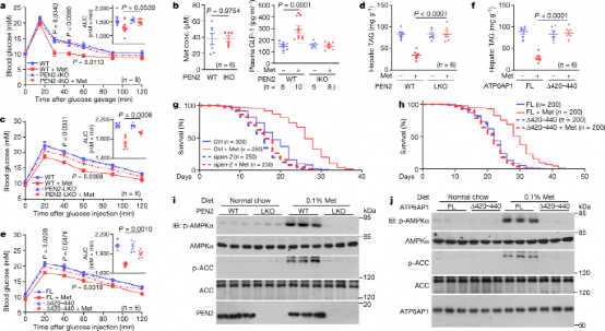 在动物模型中,肝脏特异性敲除PEN2会消除二甲双胍降低肝脏脂肪含量的效应,而肠道特异性敲除PEN2则损害其降血糖作用。此外,在线虫中敲除Pen-2基因可完全阻断二甲双胍诱导的寿命延长。这些结果共同表明,二甲双胍通过结合PEN2,并经由ATP6AP1启动一条与溶酶体葡萄糖感知通路交叉的信号途径,从而激活AMPK。该机制为解释二甲双胍在临床治疗中发挥疗效且不良反应较低的现象提供了新的分子依据。