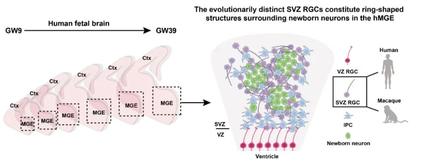 本研究成果具有深远科学意义,首次系统绘制人类胎儿MGE脑区神经发生时空图谱,鉴定出灵长类特有的SVZ RGC,填补了人类MGE脑区发育细胞图谱的空白,明确了人类大脑抑制性神经元数量扩增的关键细胞基础。研究提出的“双引擎模型”,更为解析人类大脑皮层的发育与进化规律,提供了核心的细胞与分子证据。
