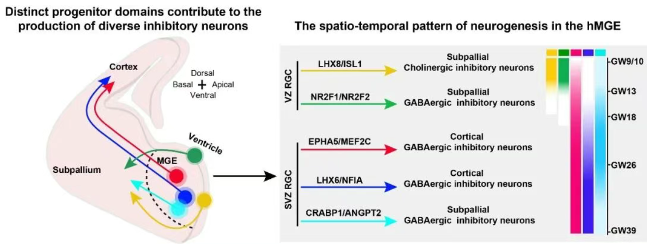 人类内侧神经节隆起神经发生的时空动态。图中不同颜色的圆圈对应不同的祖细胞域,箭头颜色则标示了由此产生的特定神经元谱系。