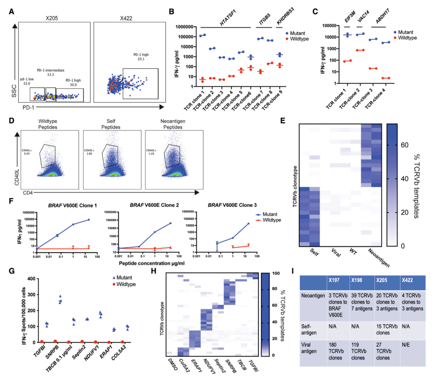 CD4+T细胞TCR克隆型 从4例患者样本中分离并筛选出能精准识别肿瘤的CD4+T细胞,通过TCRVb测序检测其免疫标识,成功鉴定出肿瘤新抗原特异性TCR克隆型,其中包括针对BRAF V600E等黑色素瘤特征突变的特异性克隆型。结果显示,肿瘤特异性CD4+T细胞的TCR克隆型在PD-1high表达的细胞中富集,且对肿瘤新抗原肽段具有特异性识别能力,为后续单细胞多组学分析提供了关键的克隆型标记。