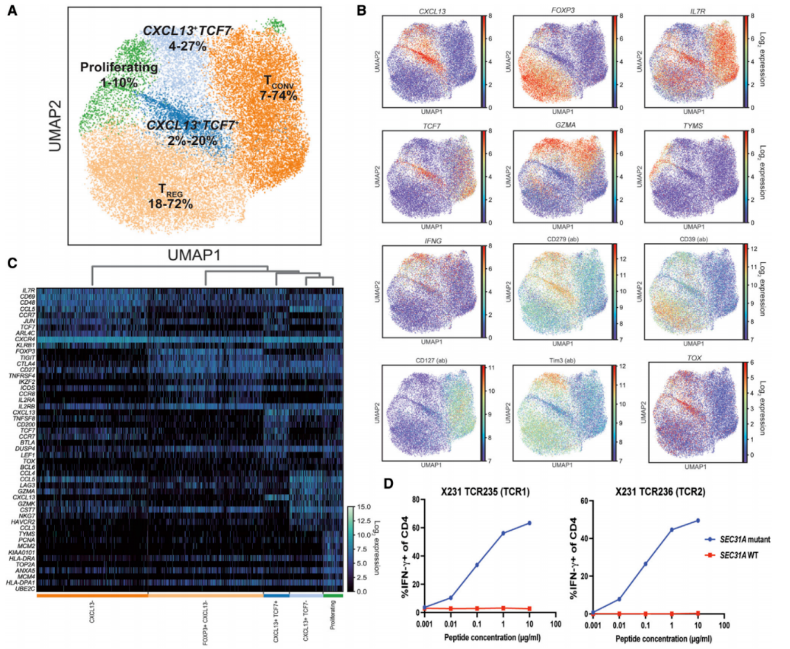 单细胞多组学分析显示,抗原特异性CXCL13+CD4+T细胞可进一步分为三个转录亚群:TCF7+CXCR5+、TCF7-Tim3+及TCF-TYMS+。将样本量扩展至20例后,对26773个CD4+T细胞的聚类分析重现了该三种亚群特征,验证了结果的可靠性,提示CXCL13+CD4+T细胞具有多样化的分化状态,可能对应不同的功能特征。
