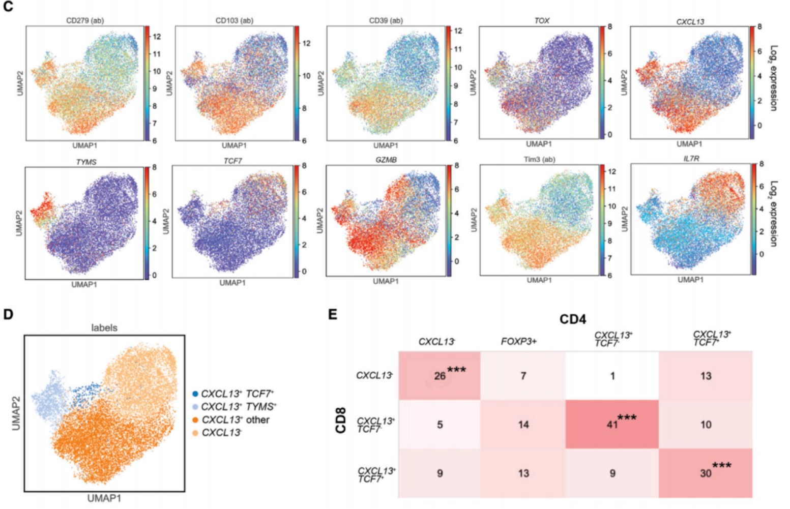 对15332个肿瘤浸润CD8+T细胞的单细胞多组学分析显示,其可聚类为4个亚群,主要表达PD-1/CD103/CD39,且部分CD8+T细胞同样表达CXCL13,分为TYMS+和TCF+亚型,与CXCL13+CD4+T细胞的亚群特征高度相似,提示二者可能存在相似的分化调控机制。