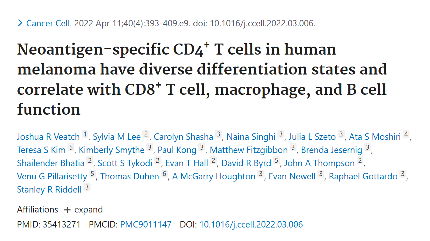 Veatch JR, Lee SM, et al. Neoantigen-specific CD4+ T cells in human melanoma have diverse differentiation states and correlate with CD8+ T cell, macrophage, and B cell function. Cancer Cell. 2022 Apr 11;40(4):393-409.e9.