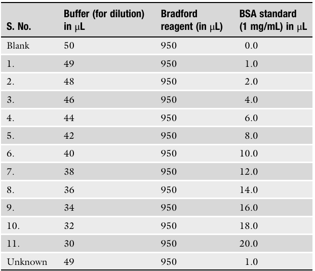 三列数据从左至右依次为:稀释缓冲液、Bradford 试剂、BSA 标准品。