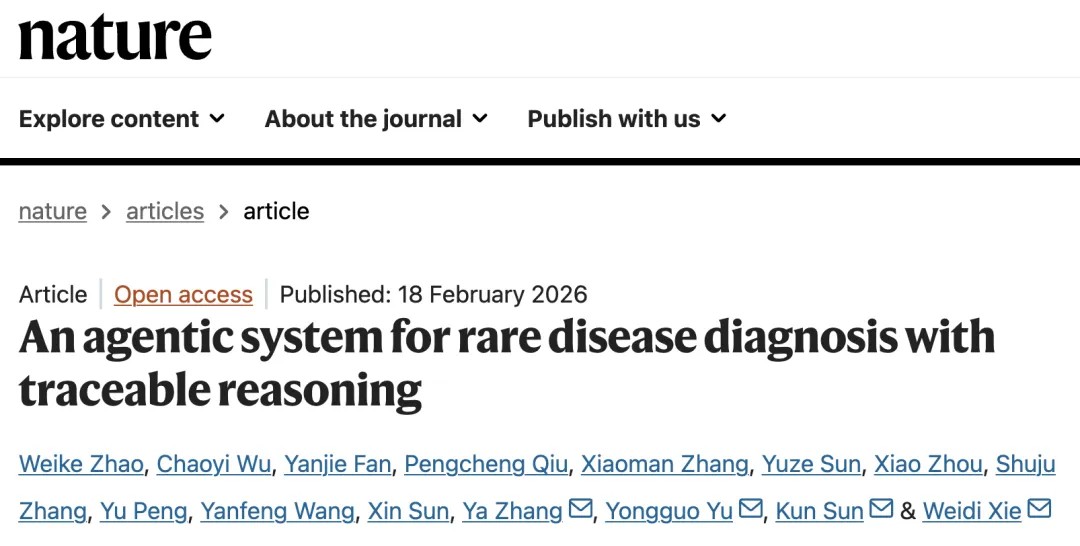 2026年2月18日,上海交通大学人工智能学院与上海人工智能实验室的谢伟迪,上海交通大学医学院附属新华医院的孙锟、余永国,以及上海交通大学人工智能学院与上海人工智能实验室的张娅,作为共同通讯作者,于国际顶级学术期刊《Nature》发表了题为《An agentic system for rare disease diagnosis withtraceablereasoning》研究论文。该研究成功开发出全球首个针对罕见病的AI智能体循证推理诊断系统——DeepRare,在罕见病诊断的精准度方面,首次超越了拥有十年以上临床经验的专家。此项成果不仅推动了罕见病诊断技术的进步,为全球三亿罕见病患者带来了实质性的希望,更是人工智能在医疗领域应用的一个重要里程碑,彰显了大语言模型驱动的AI智能体系统如何对当前临床工作流程进行革新性重塑。