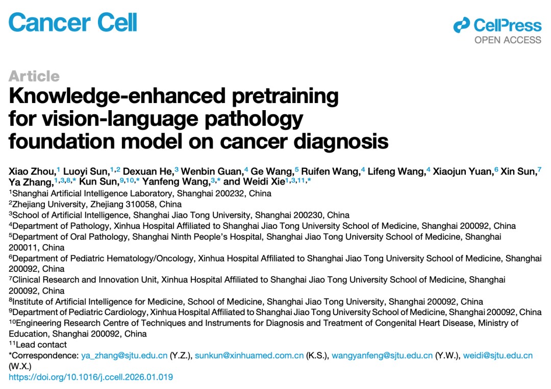 次日,即2月19日,谢伟迪、王延峰、孙锟、张娅再次作为共同通讯作者,在《Cancer Cell》期刊上发表了题为《Knowledge-enhanced pretraining for vision-language pathology foundation model on cancer diagnosis》的研究论文。
