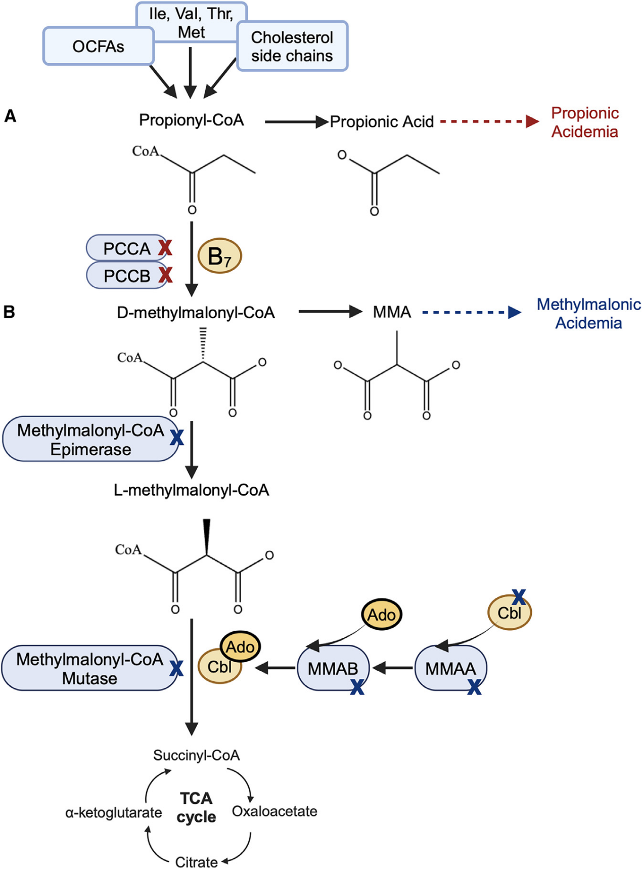 图1. 丙酸代谢失调导致甲基丙二酸血症和丙酸血症